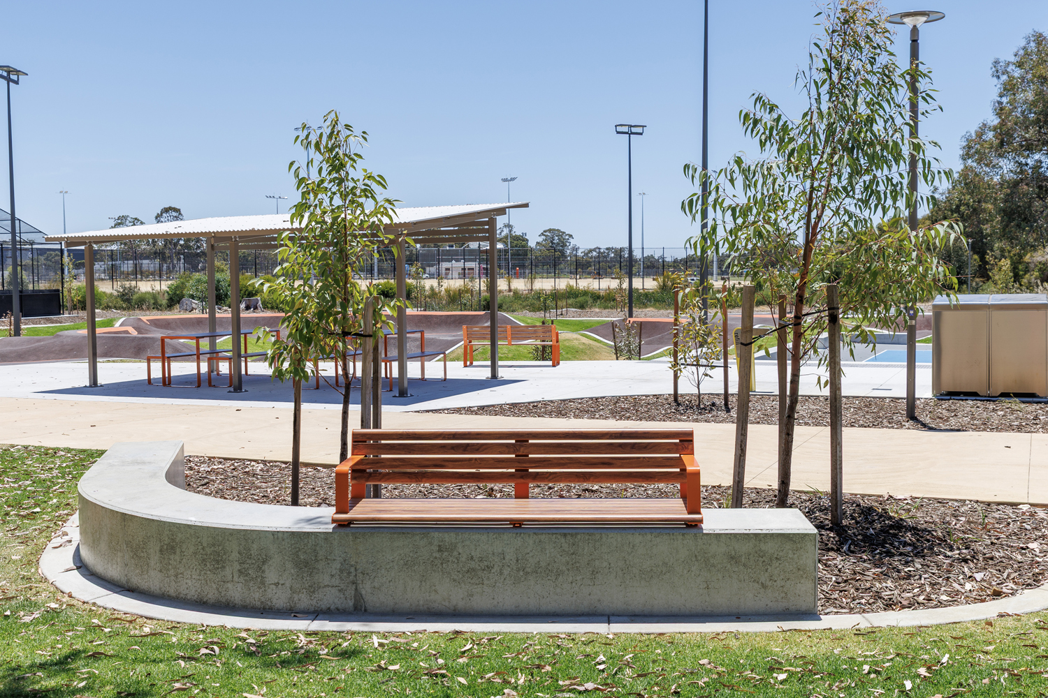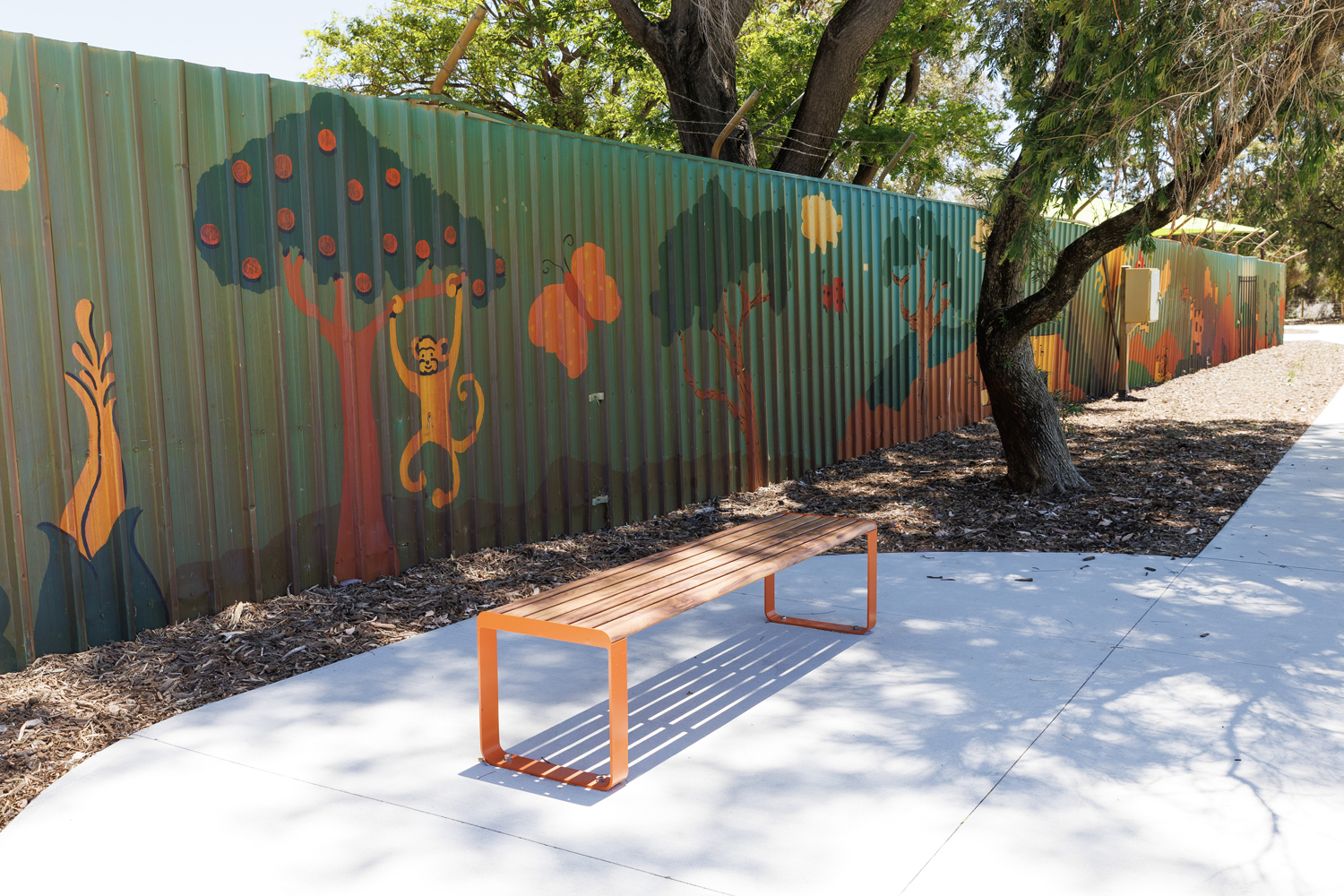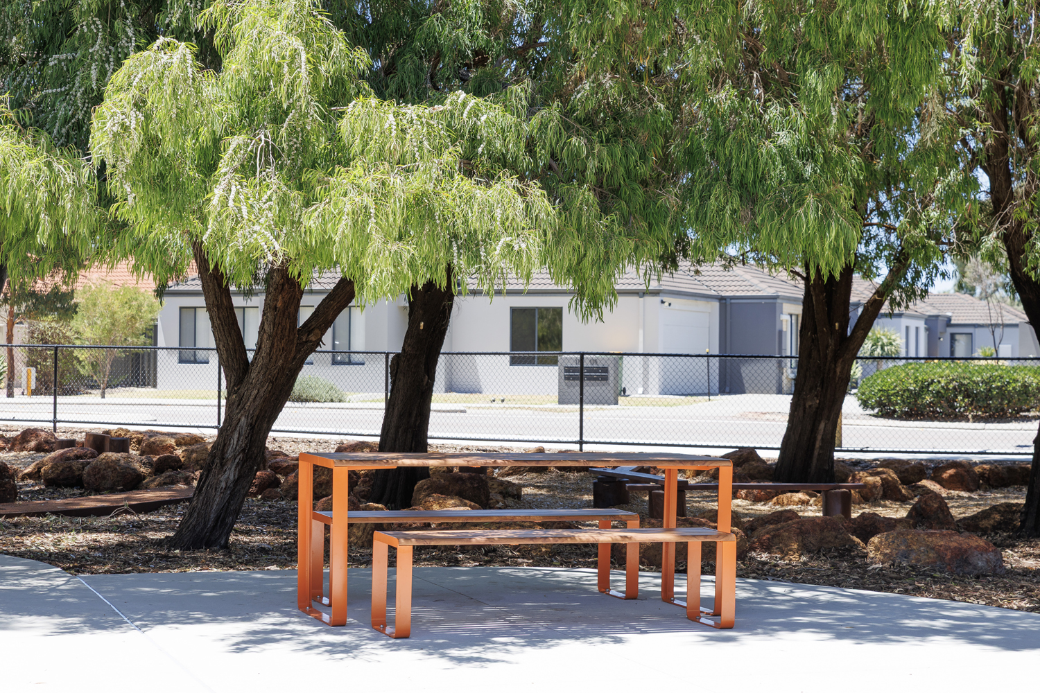 The striking local firewood banksia, Banksia menziesii, provided inspiration for the colour palette used across Maniana Park. An array of pinks, yellows and oranges appears throughout the space, including a standout orange featured on key elements and Street Furniture Australia’s Linea range.