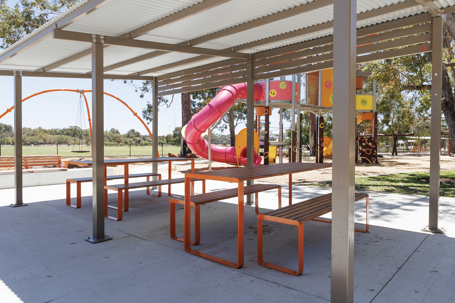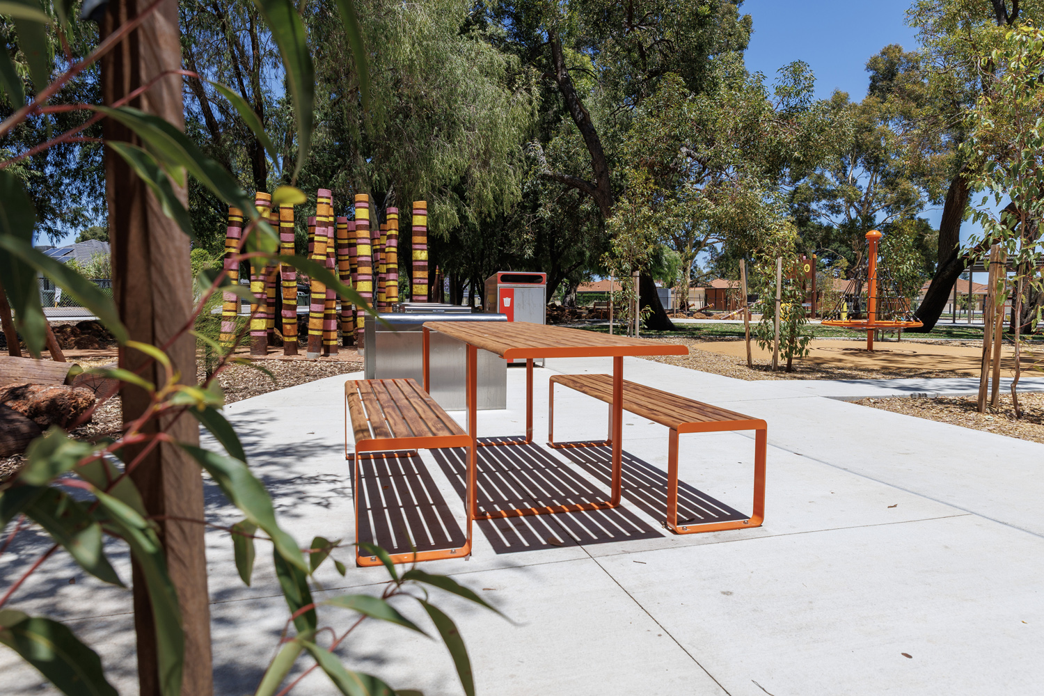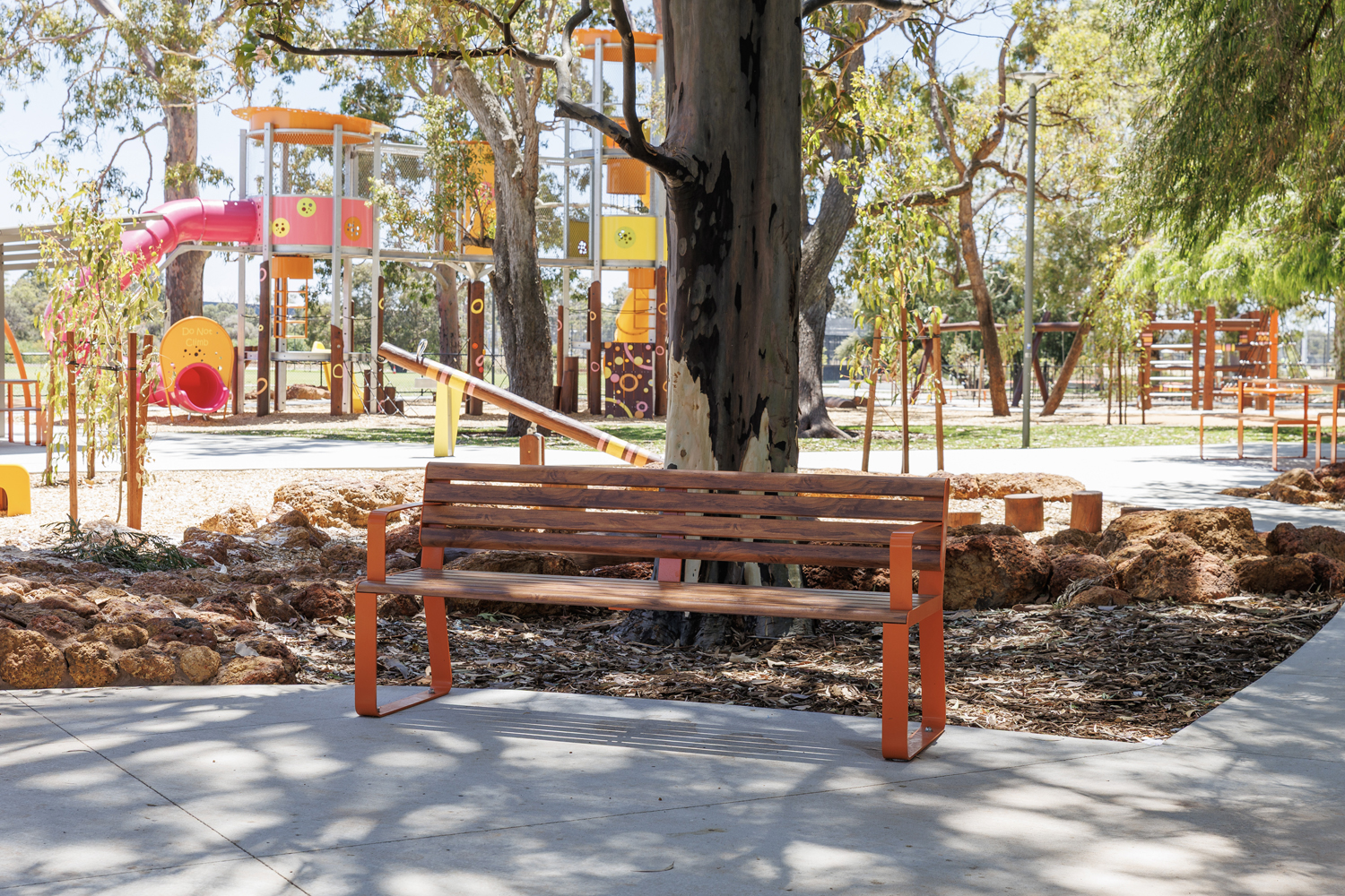 The striking local firewood banksia, Banksia menziesii, provided inspiration for the colour palette used across Maniana Park. An array of pinks, yellows and oranges appears throughout the space, including a standout orange featured on key elements and Street Furniture Australia’s Linea range.