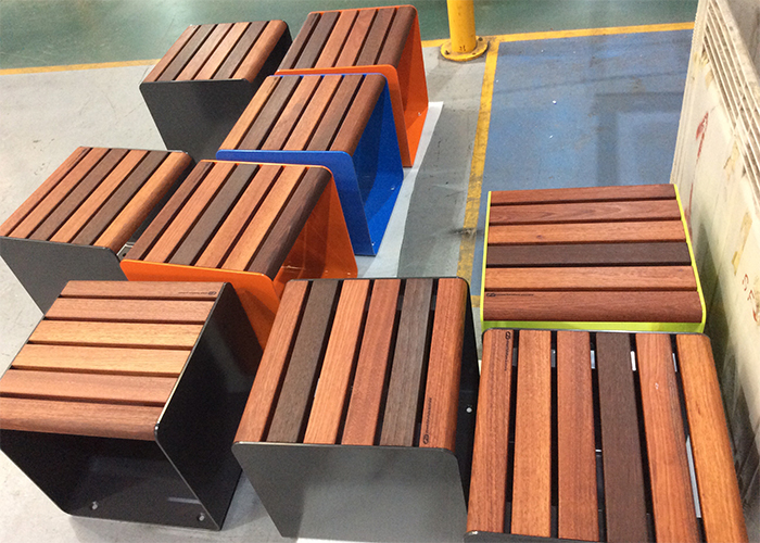 Modelled on the humble milk crate, the cubes invite students to move, sit and gather as they choose. Their timber detailing – Spotted Gum hardwood battens – matches the Spotted Gum deck in the main courtyard, reinforcing material continuity across the site.
