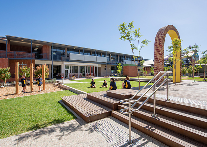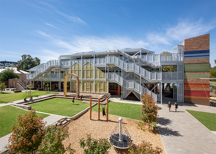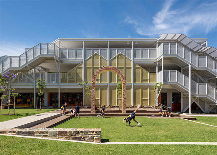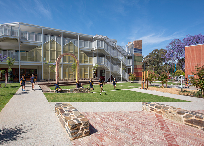 The redevelopment meets the needs of a growing school community on a compact urban site, with new classrooms built vertically to maximise open space. At its heart, a central courtyard pays homage to the original hall that once stood there, offering students a natural environment for learning, play and connection.